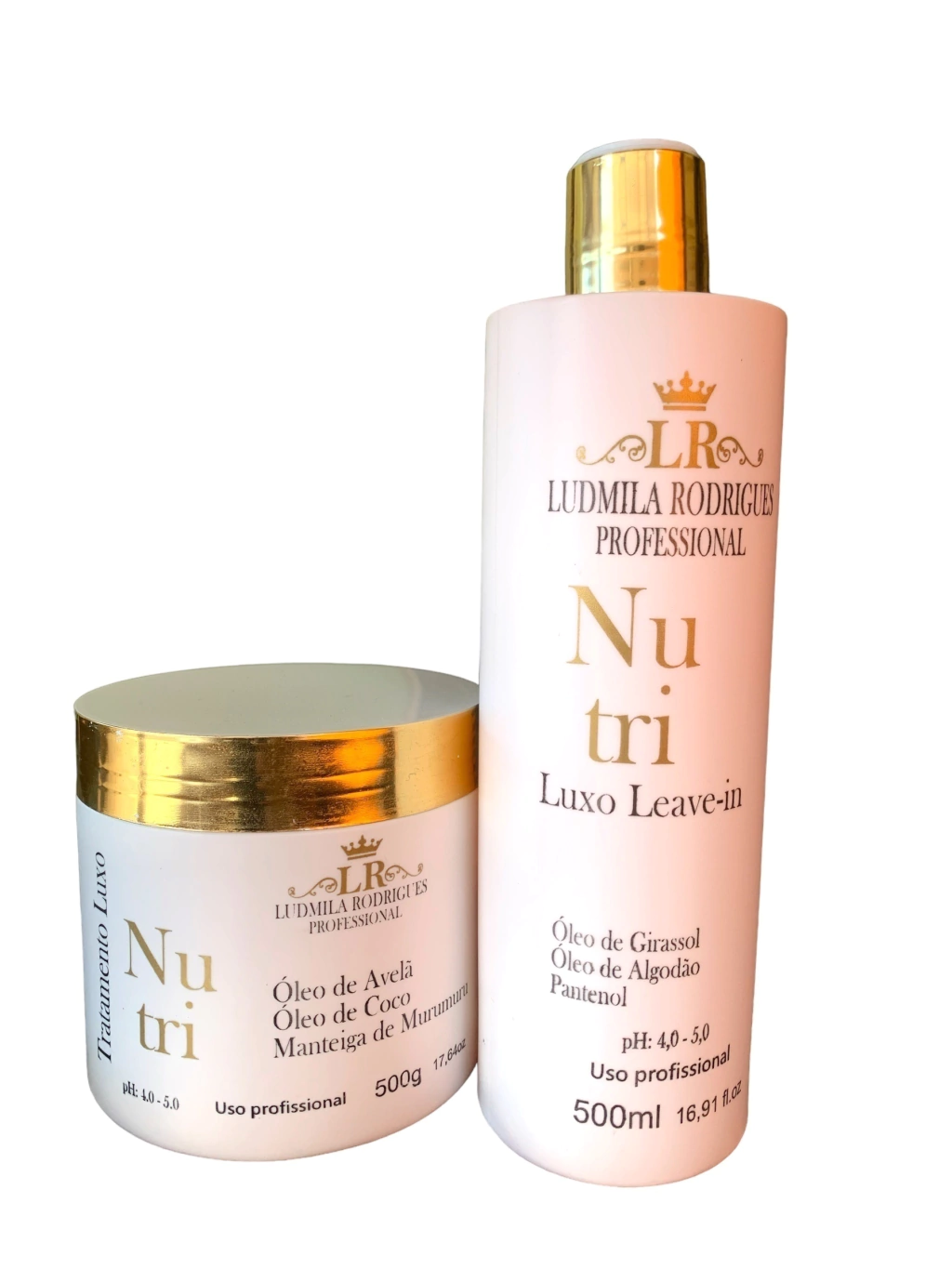 KIT NUTRI composto por 2 produtos: + 1 Nutri Luxo Leave-in de 500ml + 1 Nutri Tratamento Luxo de 500gr.